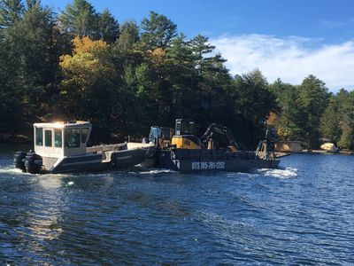 Equipped with a push barge, we can accommodate haulage capacity of up to 40 tons or smaller loads with a 26' drop gate landing craft. From getting our material/equipment to and from the job site, to septic pumping your tanks, we can move it all! Big or small!